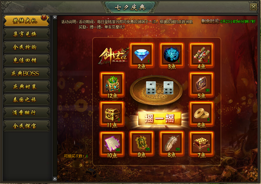 活动说明:活动期间,每日登录游戏,可免费摇筛子1次,根据点数有机会获得稀有材料、元宝匣、钻石等稀有奖励