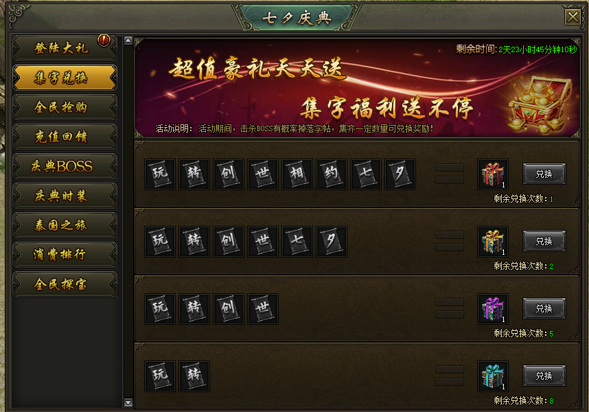 活动说明:活动期间,击杀BOSS概率掉落集字道具,集齐对应组合即可领取奖励