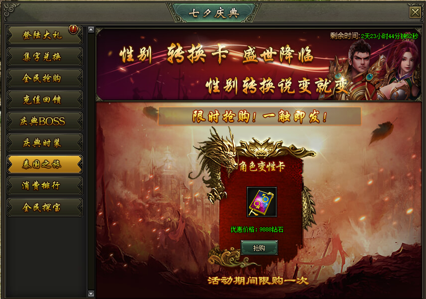 活动说明:活动期间,性别转换卡限时出售,机会难得,不可错过!
