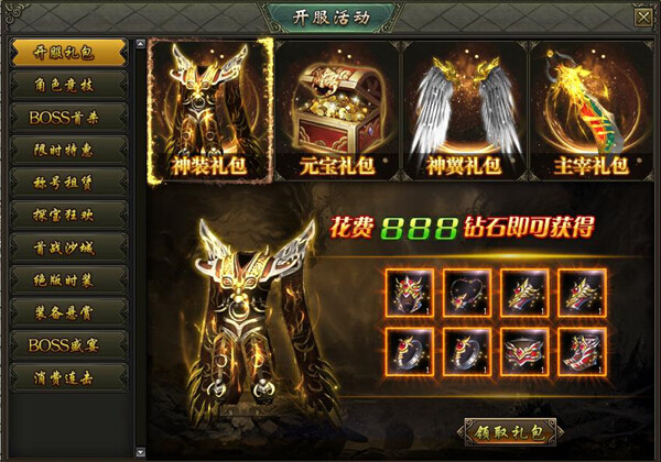 活动内容:活动期间,可以花费少量元宝购买极品神装礼包以及各种稀有道具,快速提升实力!