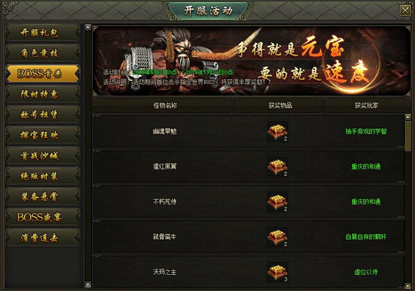 活动内容:活动期间首位击杀指定BOSS的玩家,将获得海量元宝奖励!