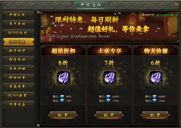 活动内容:活动期间,可在活动界面以超低折扣的价格购买大量稀有材料,机会只有一次,千万不可错过!