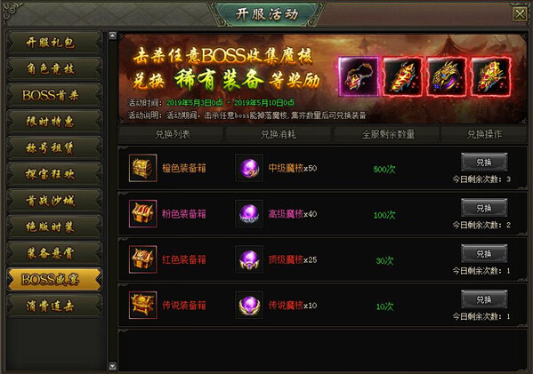 活动内容:活动期间,击杀BOSS可掉落魔核,收集不同的魔核可兑换极品装备箱奖励,全服限量兑换,赶快击杀BOSS吧!