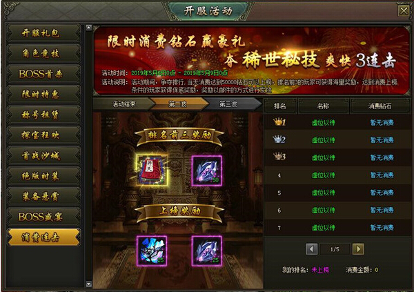 活动内容:活动期间,当日消费钻石达到5万钻石即可获取排行奖励,排名第1的玩家将获得稀世技能书奖励,超值消费,爽快3连击!