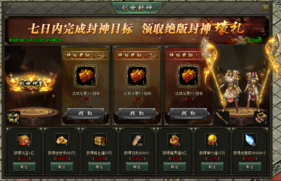 创世封神的七个目标,其中获取1亿元宝和获得创世币600w是基本上不用花什么钻石就可以完成的对玩家在活动开启前存上一些元宝匣和创世币材料,在活动开启后使用也是可以增加资源获取的。同样的获取转生值也是可以使用该方法的,这三个目标就可以轻松完成。