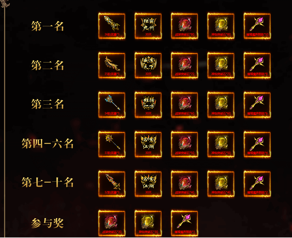 第1名(需充值1.5w元):“独霸九州”称号,36阶武器、战装突破石*80、神饰突破石*801、璀璨魔界钥匙*10