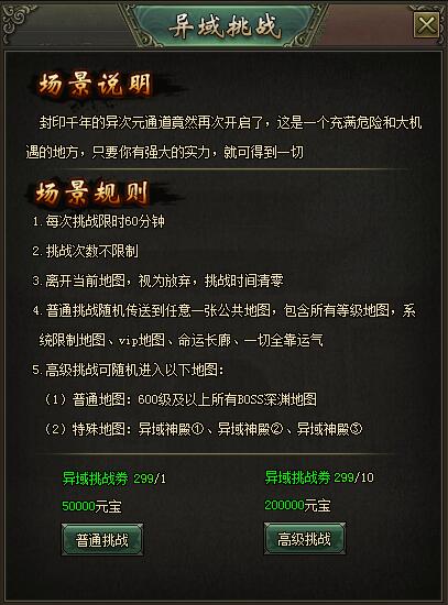 普通挑战:消耗:异域挑战券1  50000元宝