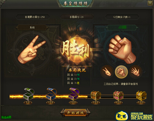 特玩网页游戏创世新增的拳皇猜猜猜,玩家和系统进行猜拳玩法,系统随机出拳胜负全凭运气,猜拳获得的积分可领取积分奖励,每周累计积分排行前10名玩家会获得奖励,积分每周日24点清零。