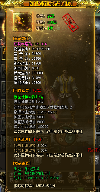 (2)诛神金装可通过使用37阶狂装备、创世金卷、至尊神石或主宰神石进阶获得