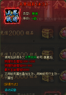 累计充值2000钻石:超·转生宝箱*5 创世圣石 强化石*10 超级宝石随机包*2