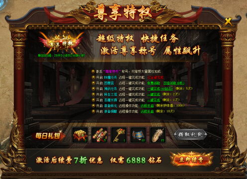 (3)激活尊享特权,开启部分日常玩法远程一键完成且享受8折多倍领奖优惠、开启远程装备捐献及装备转化、激活专属称号、领取每日尊享特权礼包