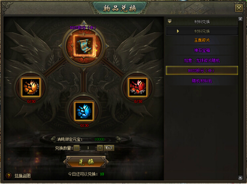 (1)开服≥30天,开启道具兑换功能,可通过蛮荒部落对应NPC打开兑换界面
