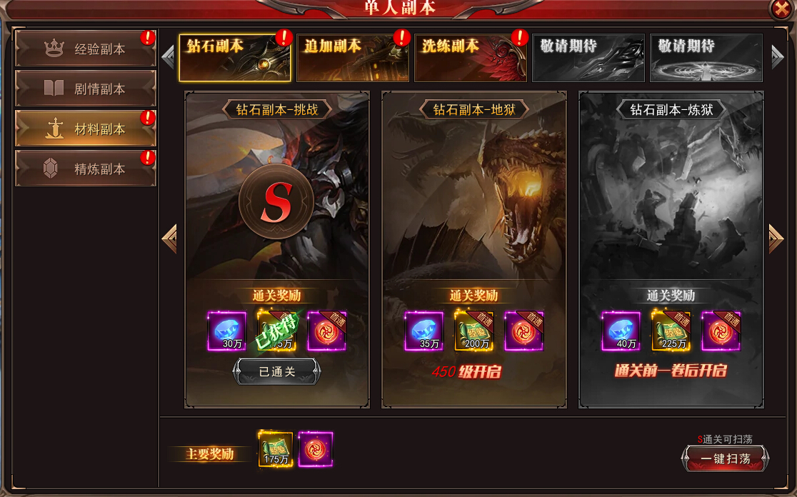 材料副本目前开启了钻石副本、追加副本和洗练副本,每个副本都有简单、普通、困难、精英、试炼、挑战、炼狱、圣狱和终极9个等级,s通关后才可以开启下个等级的副本进行挑战,之后可以进行一键扫荡副本,当然不同等级分别对级别进入也是有要求的。