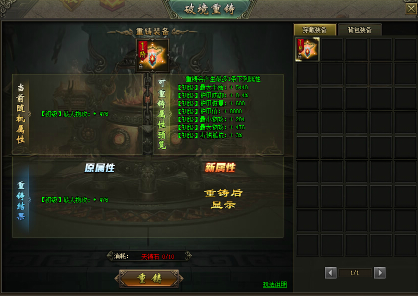 1.可消耗天铸石对极品以及以上的破镜装备进行重铸,重铸后随机生成属性。