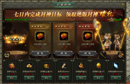 热血战歌之创世中最新更新了创世封神,七日完成全部的封神目标,即可领取绝版奖励(黄龙偃月刀和仁义兄弟)。如何可以完成全部的封神目标呢,下面小编给大家一一介绍。