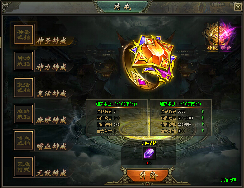 传说特戒雕纹升级:需要消耗传说雕文石,雕文升级后可以增加物理攻击、物理防御、最大生命和爆伤抵抗属性。传说雕文石可以通过活动产出。