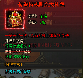 传说特戒雕文大礼包:传说特戒雕纹*30,原价:15888钻石,现价:6988钻石。