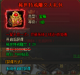 稀世特戒雕文大礼包:稀世特戒雕文*20,原价:16888钻石,现价:7988钻石