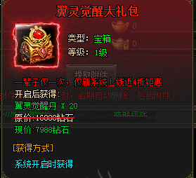 翼灵觉醒大礼包:翼灵觉醒丹*20,原价16000钻石,现价:7988钻石