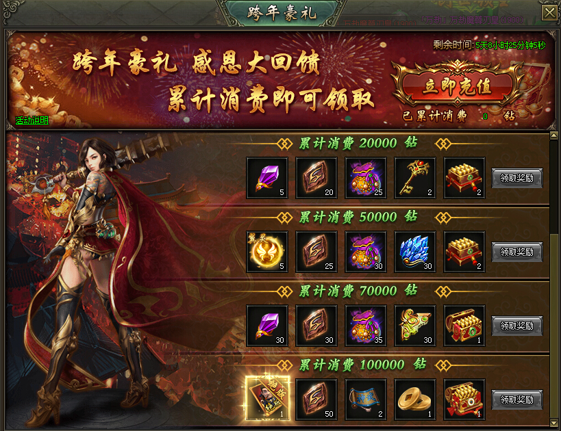 累计消费50000钻:翼灵觉醒丹*5、强化石*25、魔纹随机包*30、龙珠碎片*30、高级元宝盒*2