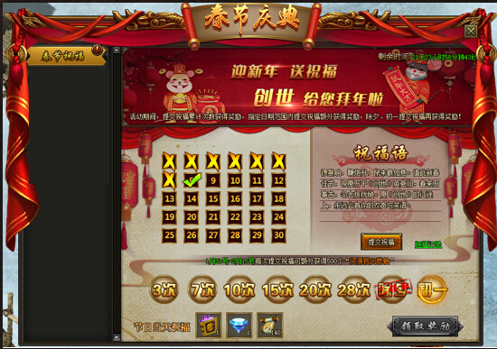累计祝福15次:龙珠碎片*100、5000创世币*20、高级元宝盒*30、玉佩碎片*800