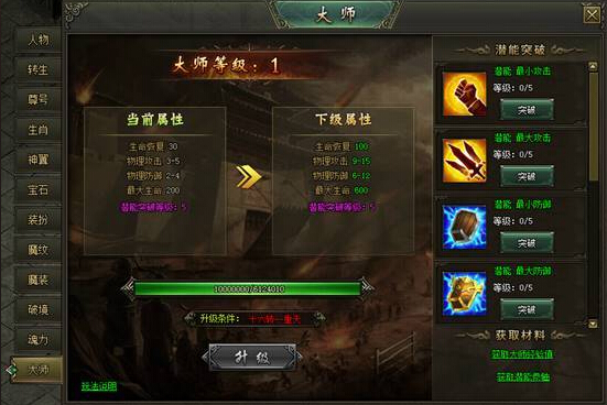 4.提升大师等级获得潜能突破等级属性,突破潜能等级可获得属性加成