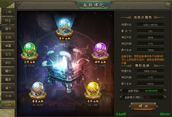 2.5种血脉可分别进行炼化培养,高阶血脉需低级血脉达到指定等级开启