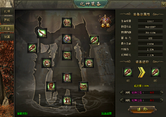 1.化神装备一共12个部位,可消耗材料直接进阶