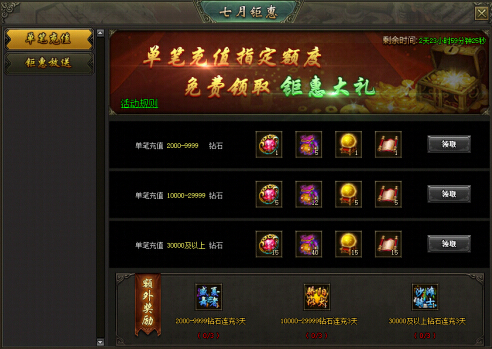 4.活动期间累计领取单笔充值奖励三次的玩家可以领取对应的额外奖励