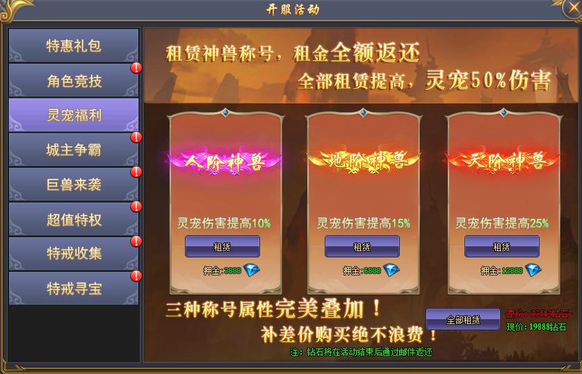 活动说明:活动期间,限时购买灵宠神力,神力可叠加拥有,活动结束全额返还!