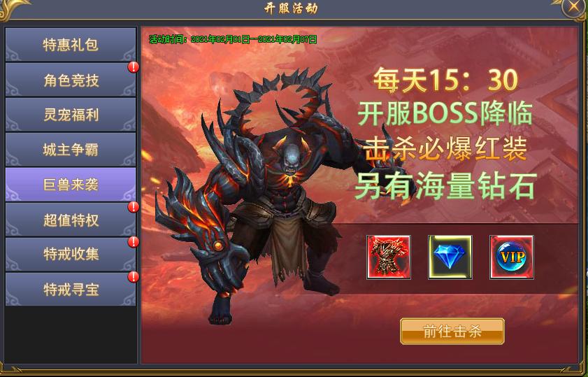 活动说明:活动期间,每日限时开启开服boss,击杀获得海量钻石等极品豪礼!