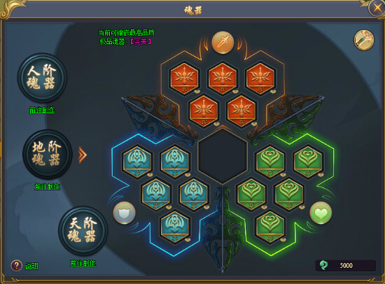 l 查看入口:人物面板第七个页签 l 魂器内容 通过材料制作可随机获得一个品质的魂器,魂器品质:普通<优秀<无暇<卓越<完美 装备15件普通魂器后可以装备极品魂器 每个品阶的极品魂器都有一个技能或者特殊属性
