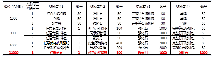 举例1:玩家A活动期间充值了1W元档次,即可领取1W元的档次