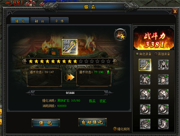 强化消耗黑铁矿石和铜钱,黑铁矿石通过挖矿、商城购买和行会秘境获得;