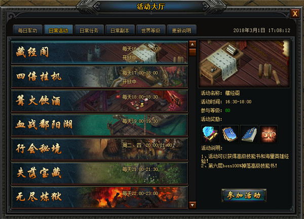 ◆点击界面右上角活动图标打开活动大厅,活动大厅里可以看到每天的日常活动有哪些、什么时候开始和什么时候结束。