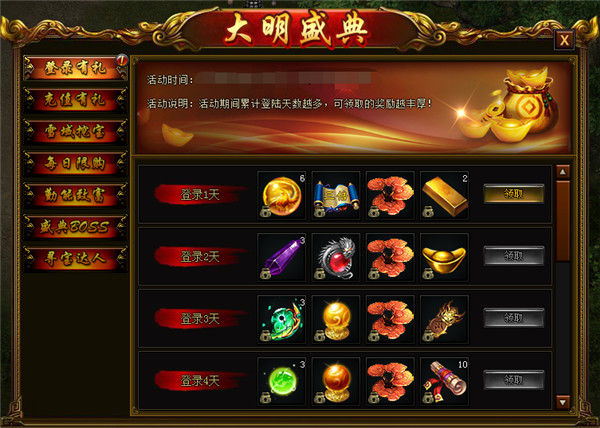 【活动说明】:活动期间累计登陆天数越多,可领取的奖励越丰厚!