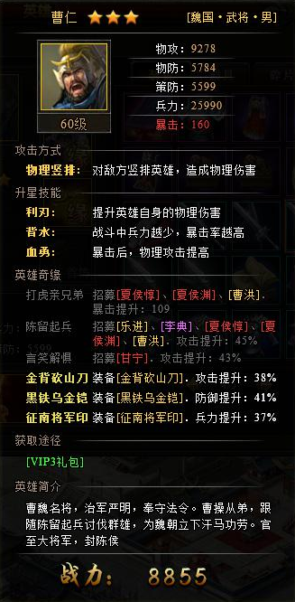 曹仁,前期推图器,首充送的,攻击还可以,最重要的是他送全套啊,只要180,满星满装备全套就有了,有了这孙子,老子过关再也不用费劲了,领了就能用,入手就能飞!