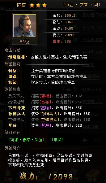 陈宫,金将里的输出一哥,如果你给自己的定位是V4或者以下,弄个陈宫吧,这将是你很长一段时间的主力输出将,配合张春华的治疗,几次BUFF叠上来以后也是猛地不像话,竖排将,还能打到后排,不要太厉害。奇缘也不难开,披风也是有活动掉落的。