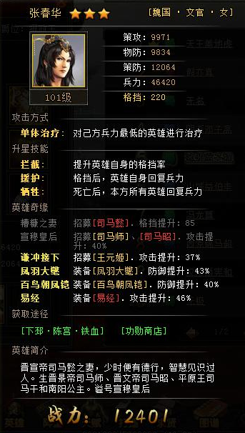 张春华,大家的便宜二奶,活着能单加,死了还能群加,她是目前是除了华佗以外唯一能配合机智、号角、擂鼓、奏乐、酒豪等技能的治疗将。兵力多,硬度够,是个关键时刻能站出来的女人。入手门槛低,奇缘好开,司马懿的老婆,谁用谁知道~