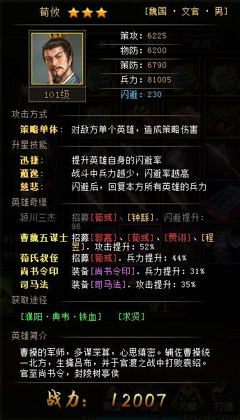 荀攸,别看我是个金将,我有颗红将的心!管你是一毛不拔的铁公鸡,还是挥金如土的RMB战士,你想走闪避流,先搞一个再说吧,闪避暴击流出张辽之前这个黄狗你是必须有的,出了张辽你没华佗的话就张辽荀攸一起上。兵力暴高,有群回技能,注定了他是个站在最前面挨打的男人。闪避流玩家都会优先刷满他,缘分也是相当好开,我摸着良心为他安利一波。