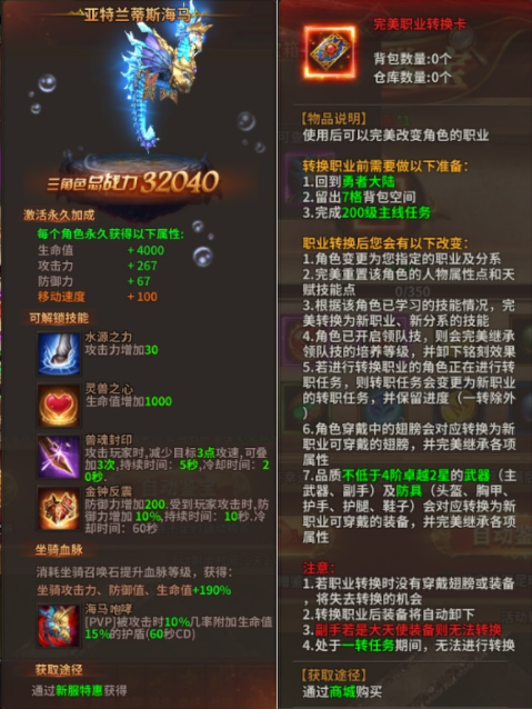 亚特兰蒂斯海马为紫色品质坐骑,激活可以为每个角色提供攻击力+267,防御力+67,生命值+4000,移动速度+100,3个角色至少增加32040战力!