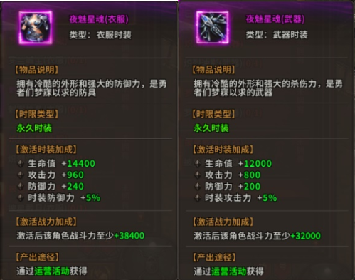 夜魅星魂(衣服)为炫酷时装,为单个角色提供攻击力+960,防御力+240,生命值+14400,时装防御力+5%,至少增加38400战力!