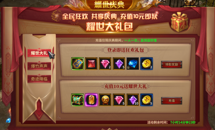 (1)在耀世庆典当天,登录即送狂欢礼包,狂欢礼包只限当天登录领取,各位奇迹守护者前往不要错过哦!