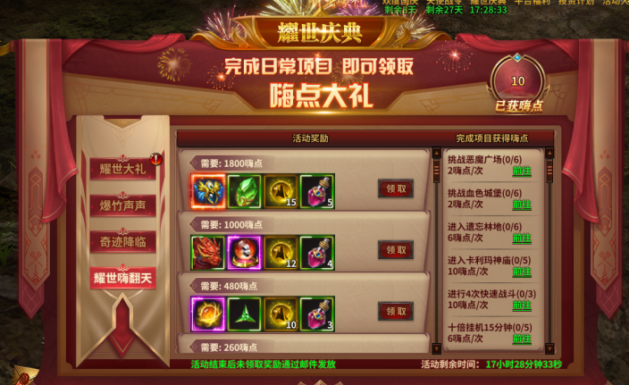 (1)新增耀世嗨翻天活动,只要在庆典当天完成日常项目,即可获得嗨点,当获得嗨点达到对应档位配置数量时即可领取嗨点奖励。