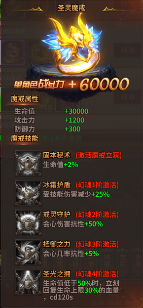 (1)圣灵魔戒之心:可在新增的魔戒系统中激活圣灵魔戒,激活后该角色战力至少增加60000!