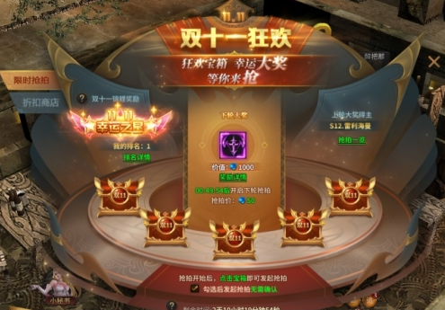 当限时抢拍全部结束后,抢拍获得大奖次数最多的玩家,将成为本次活动的“双十一锦鲤”,并获得专属奖励 :永久称号“幸运之星”,奖励将在活动结束后通过邮件发放;