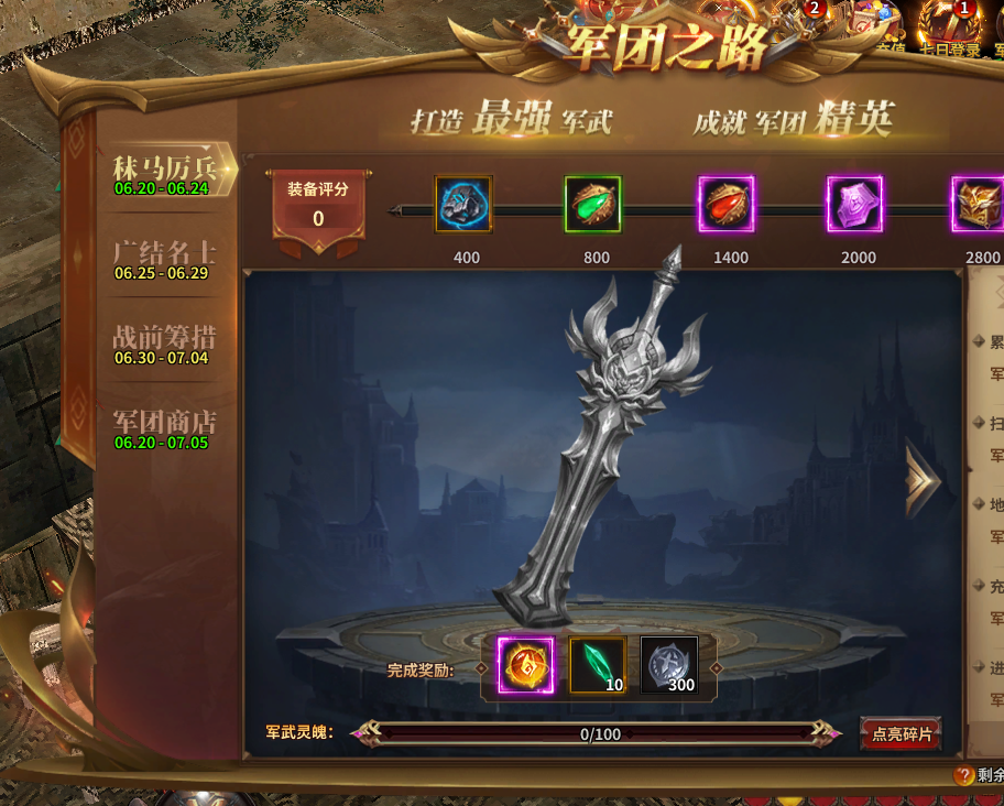 (2)秣马厉兵可通过完成军武委托任务获得军武灵魄,每达指定灵魄数量即可点亮一个碎片。每件军武集齐全部碎片后可领取丰厚奖励。同时在限定时间内,收集的军武碎片越多,装备评分越高,可获得进度奖励越丰厚