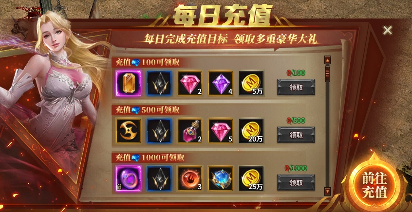 特玩《暗黑大天使》每天都有6个档次的礼包可以领取,分别是充值达到100钻石、500钻石、1000钻石、2000钻石、5000钻石、10000钻石。