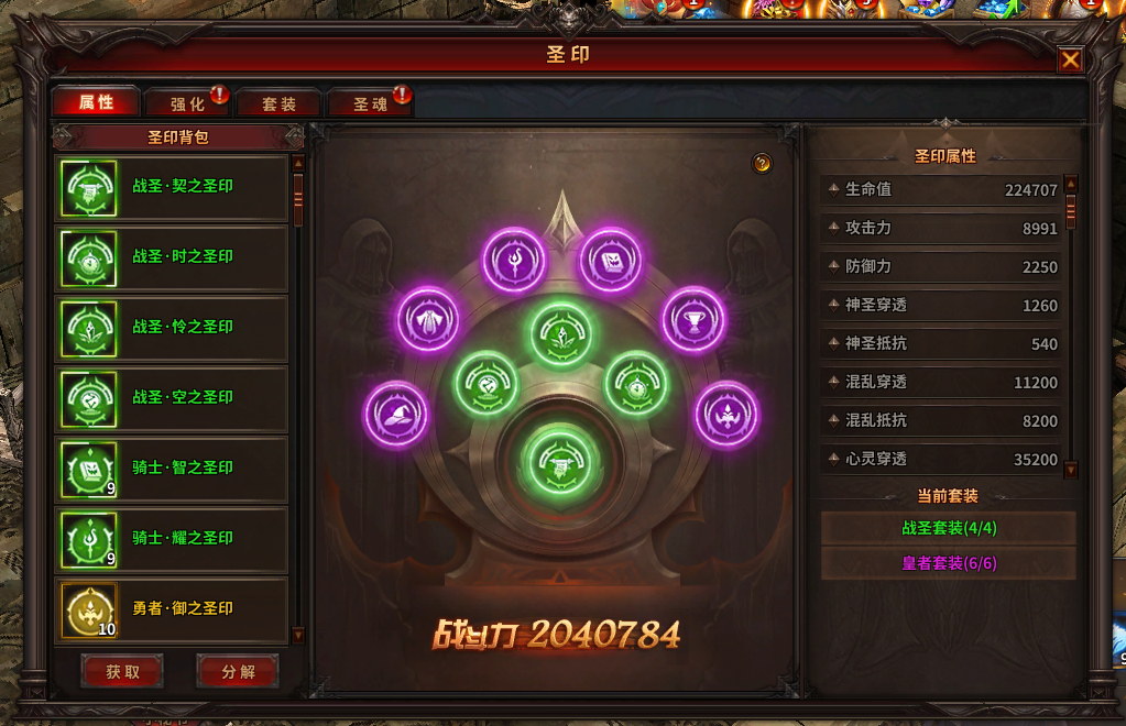 2) 分解多余的圣印可以获得圣印经验,用来提升圣印等级,在更换圣印时会继承原圣印等级;