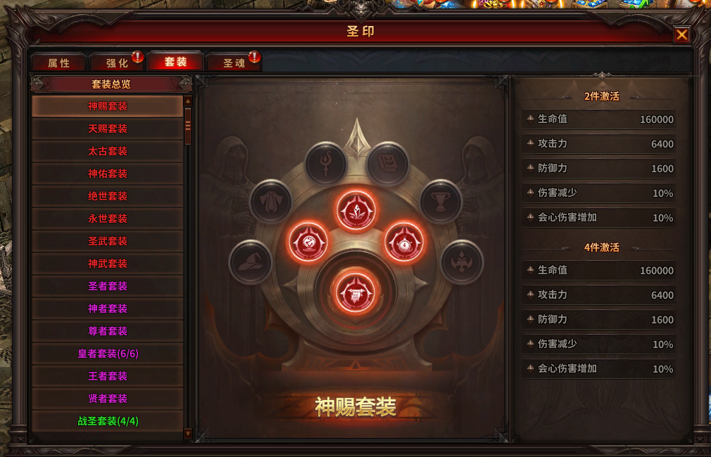 1) 圣印共10个镶嵌孔,有6种品质,品质越高属性越强。角色佩戴圣印后,可获得圣印属性,集齐同前缀的圣印即可激活套装效果;